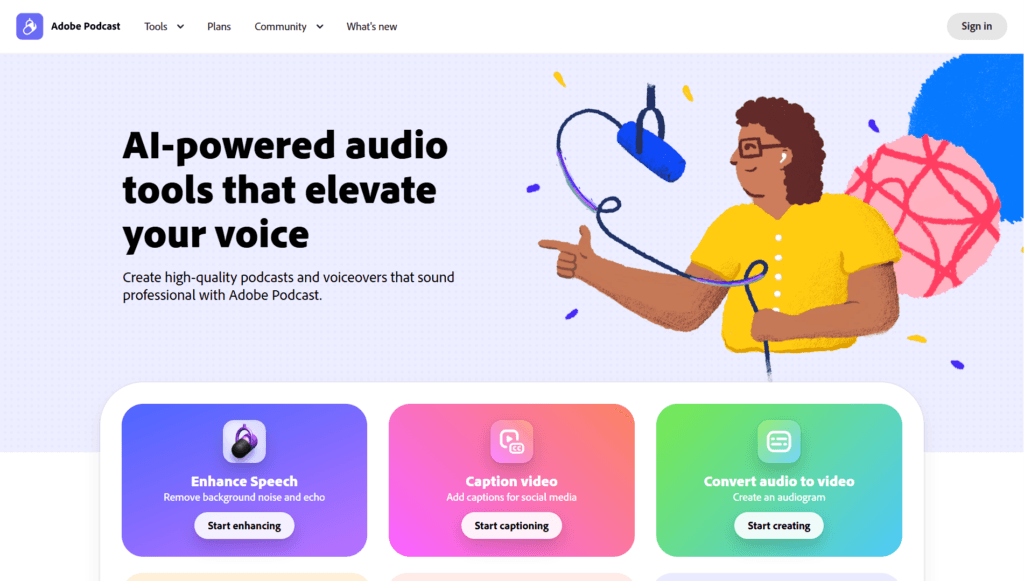 Adobe Podcast is a browser-based AI tool suite from Adobe for creating and enhancing high-quality audio content like podcasts and voiceovers.