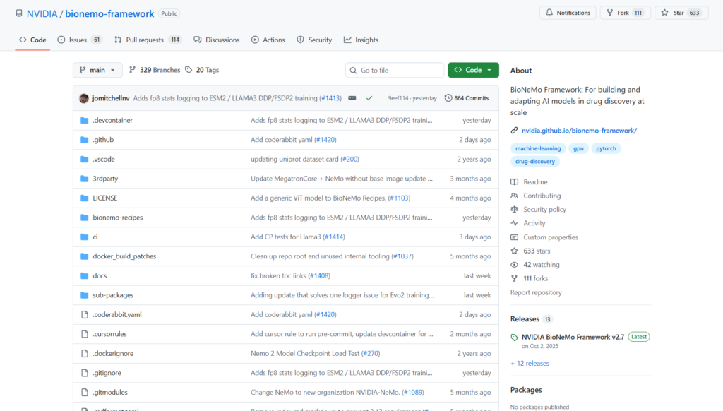 BioNeMo Framework is NVIDIA’s open-source suite for building, training, and adapting large biomolecular AI models for drug discovery and digital biology, with GPU-optimized recipes and parallelism.