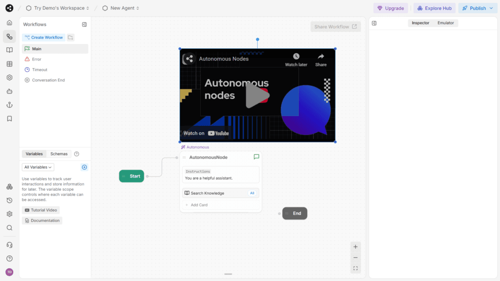 - Build flows: Drag nodes for greetings, questions, LLM calls, tools, and logic