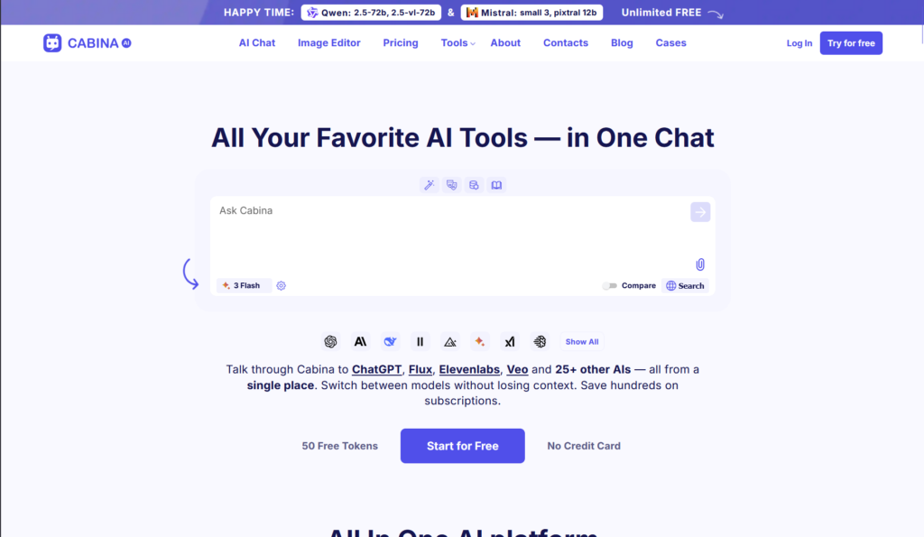 Cabina AI is an all-in-one AI platform that lets users chat with multiple LLMs (ChatGPT, Claude, Gemini, Grok, etc.) in one workspace, generate text/images/videos/audio, compare responses, and access tools like transcription and editing.