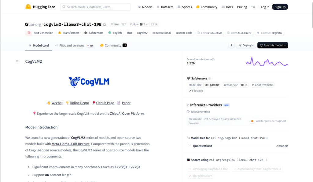 Online demos available at cogvlm2-online.cogviewai.cn:7861 (image) and :7868 (video); also via ZhipuAI platform.