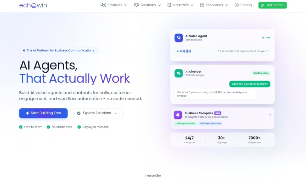 Echowin is a no-code AI platform for building voice agents and chatbots that answer calls 24/7, handle customer interactions, book appointments, and automate business workflows with custom voice cloning.