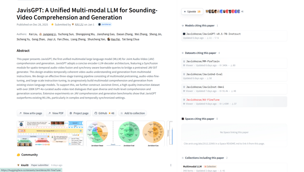 Released as an open-source project in late December 2025 (NeurIPS 2025 Spotlight), with code, preview checkpoint (JavisGPT-v0.1-7B-Instruct), and dataset available on Hugging Face and GitHub.