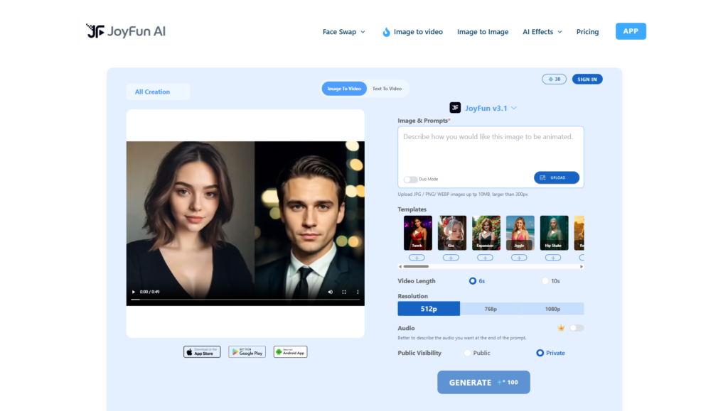 JoyFun AI is a 100% free, unlimited AI video generator offering face swap, image-to-video animation, text-to-video creation, and specialized effects/templates without sign-up or credits.