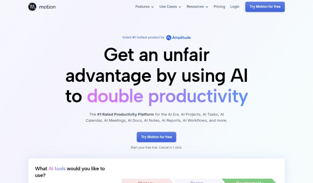 Motion is an AI-powered superapp for work that integrates tasks, projects, calendar, meetings, docs, notes, and autonomous AI agents into one platform for automated planning and productivity.