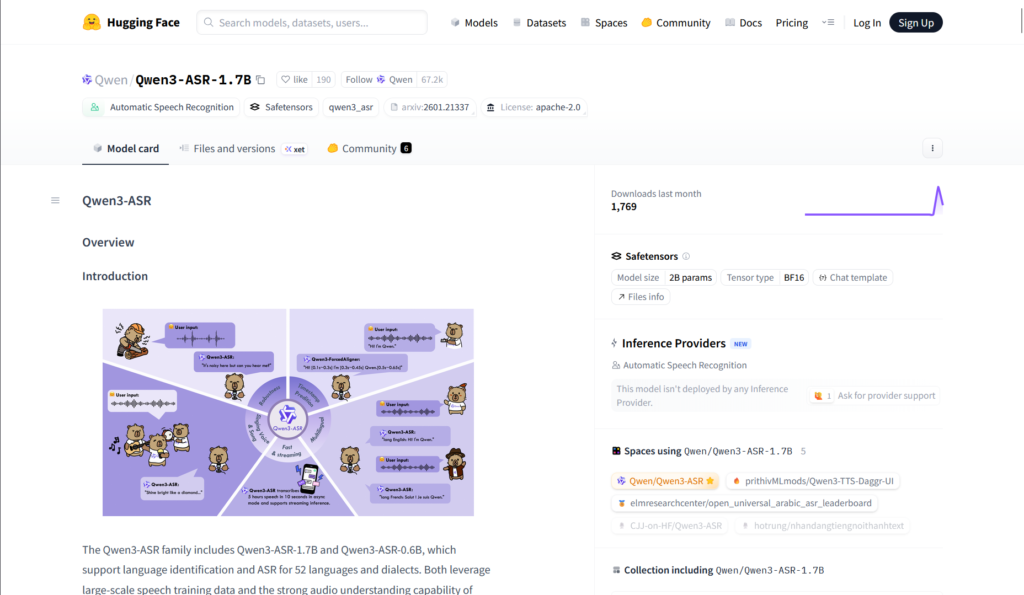 Qwen3-ASR is an open-source automatic speech recognition model family from Alibaba’s Qwen team, with the 1.7B version offering state-of-the-art multilingual transcription, language identification for 52 languages/dialects, streaming support, and strong performance on singing and noisy audio.