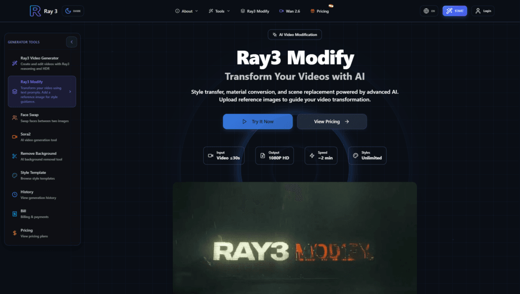 - Free ($0): Basic access and testing likely available (common for Ray3 platform); exact limits not specified on Modify page
