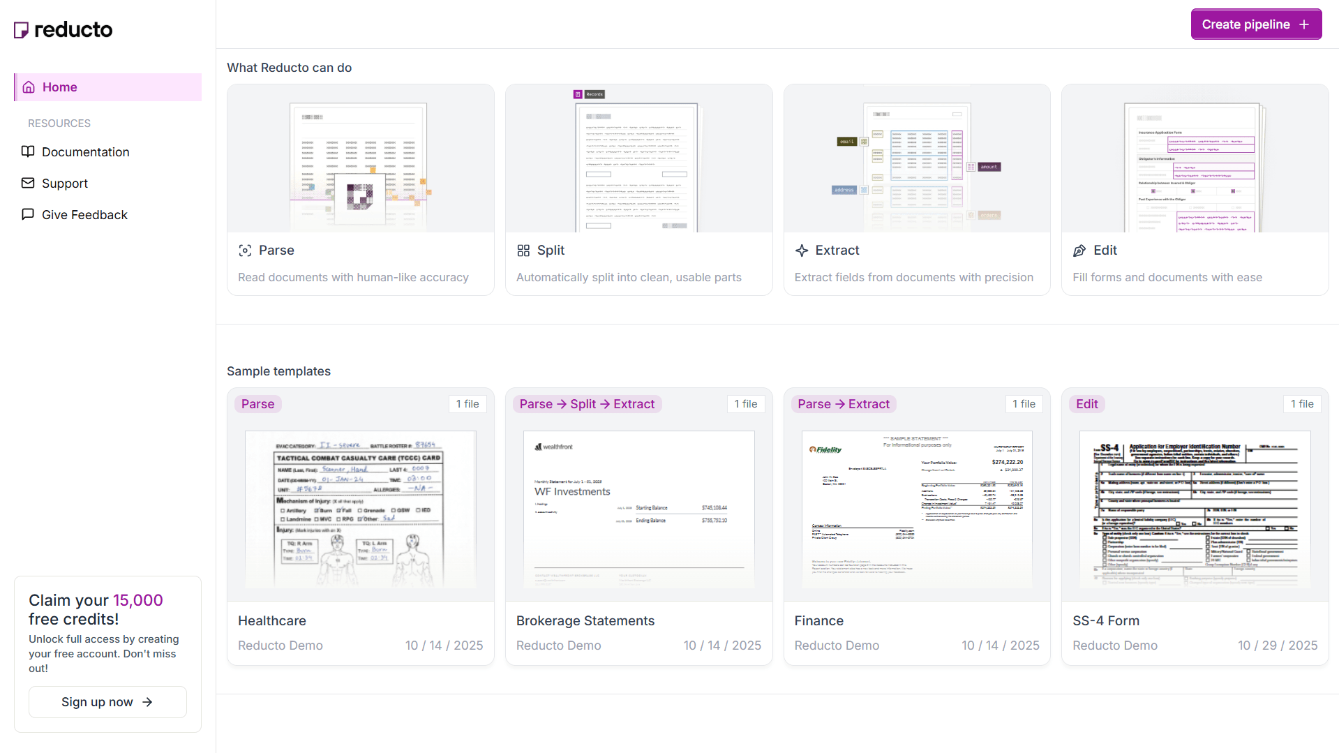 Reducto offers a free tier with 15,000 credits for new users to test the API. After that, the standard rate is $0.015 per credit (roughly per page).