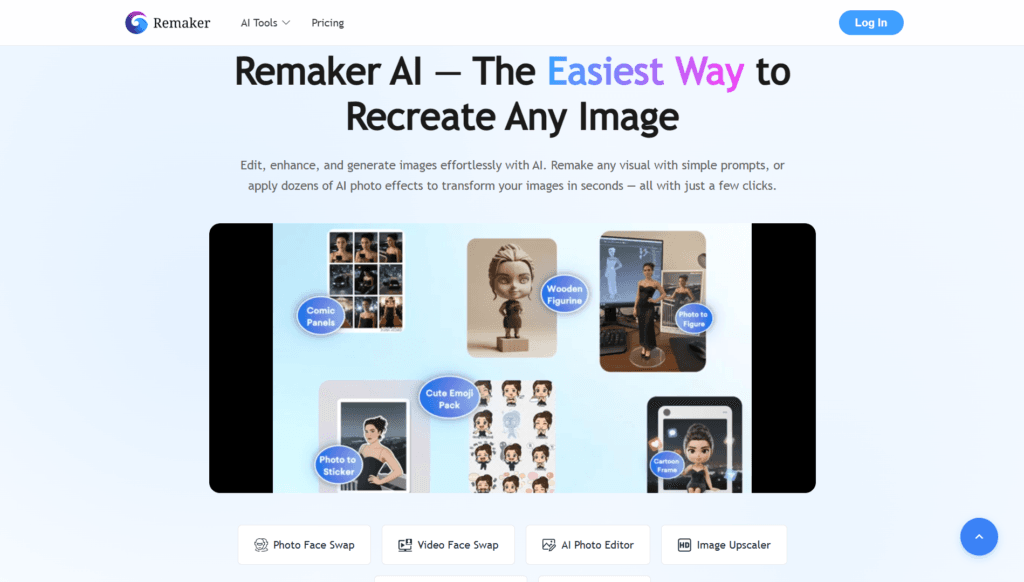 Remaker AI is a comprehensive AI-powered creative platform specializing in image editing, generation, and video tools.