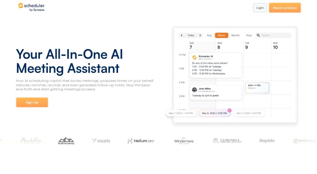 Scheduler AI is an autonomous AI agent that books, manages, reschedules, reminds, records, and follows up on sales and marketing meetings through natural conversations over email, webchat, text, or forms.