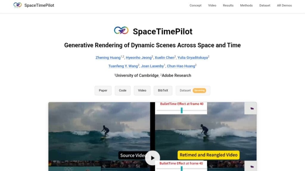 SpaceTimePilot is an open-source research model introduced in a December 2025 arXiv paper, designed for generative rendering of dynamic scenes with disentangled space and time control.