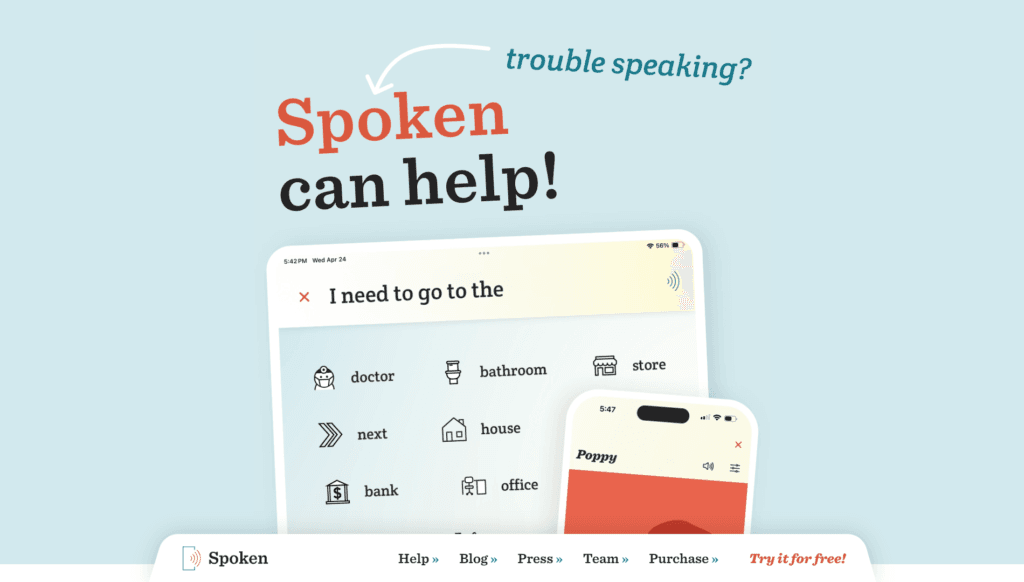 Spoken is a mobile augmentative and alternative communication (AAC) app designed for teens and adults who have difficulty speaking due to conditions like nonverbal autism, aphasia, stroke, ALS, cerebral palsy, Parkinson’s, or other speech/language disorders.