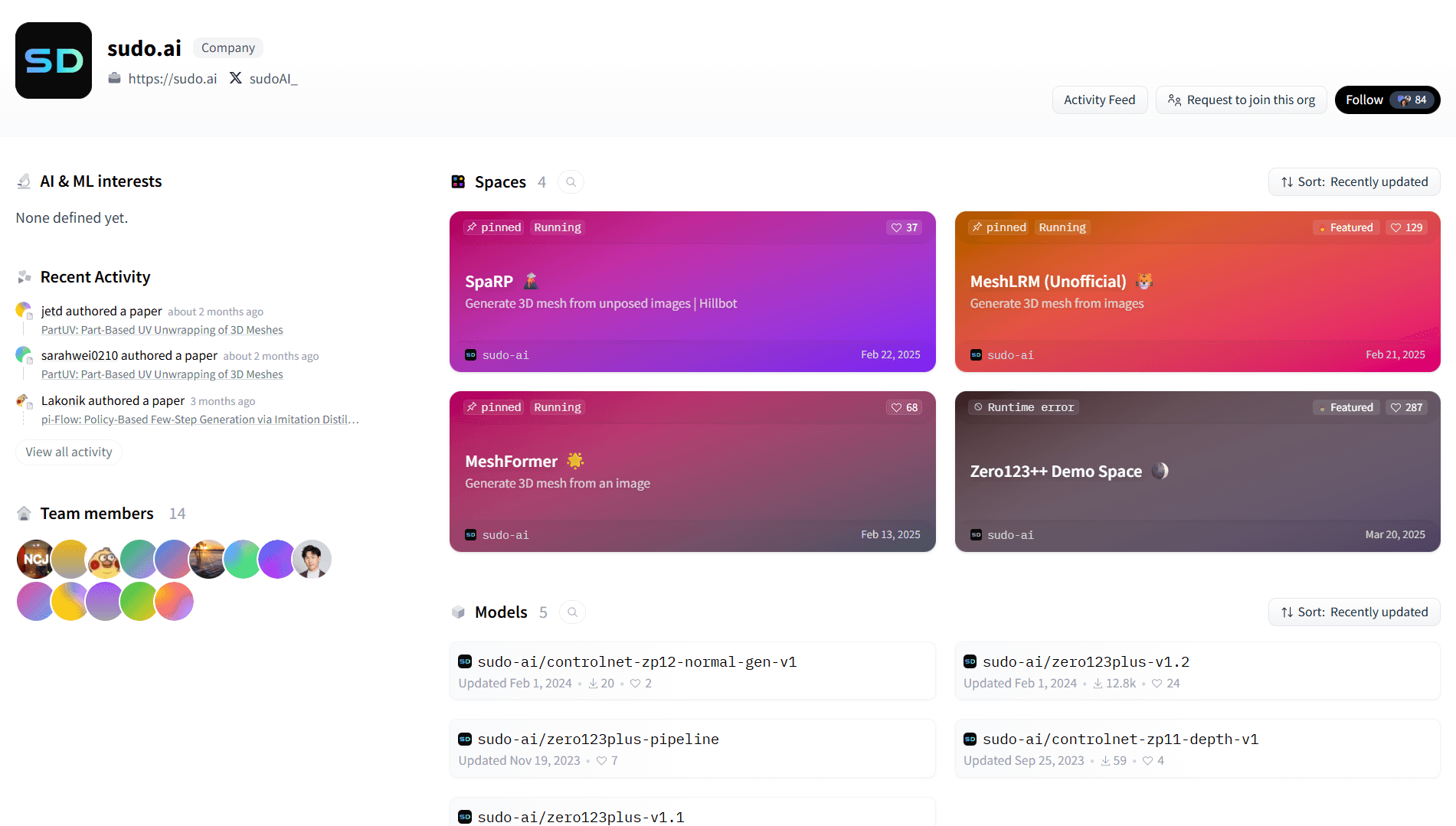Sudo AI is a research focused AI company that builds and open-sources advanced models for 3D mesh generation from images, with popular contributions like Zero123++ available on Hugging Face.