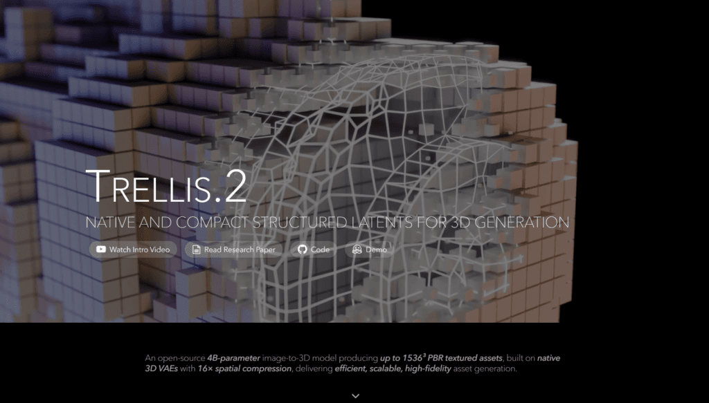 Trellis 2 is Microsoft’s open-source large 3D generative model with 4 billion parameters, specializing in high-fidelity image-to-3D generation.
