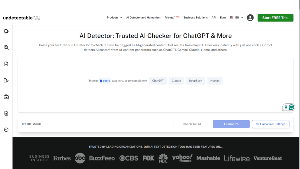 - Free ($0): Unlimited AI detection checks (multi-detector), limited humanizer words/trials (e.g., 250 words in some offers), basic features