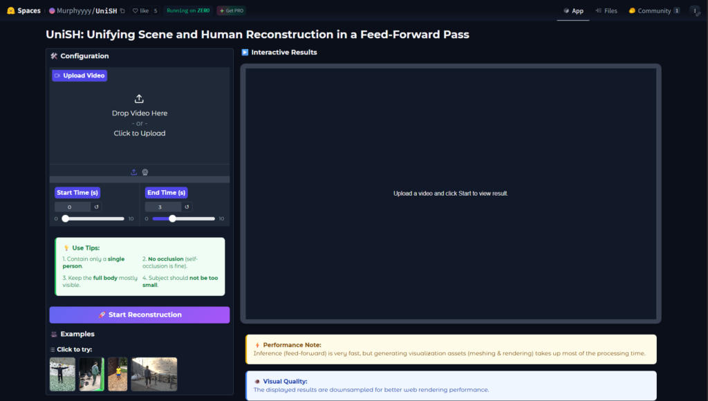 UniSH is a research AI model and framework for joint metric-scale 3D reconstruction of scenes and humans from monocular video in a single feed-forward pass.
