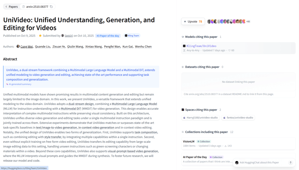 Model weights are on Hugging Face (KlingTeam/UniVideo) and full code/repository on GitHub (KlingTeam/UniVideo).
