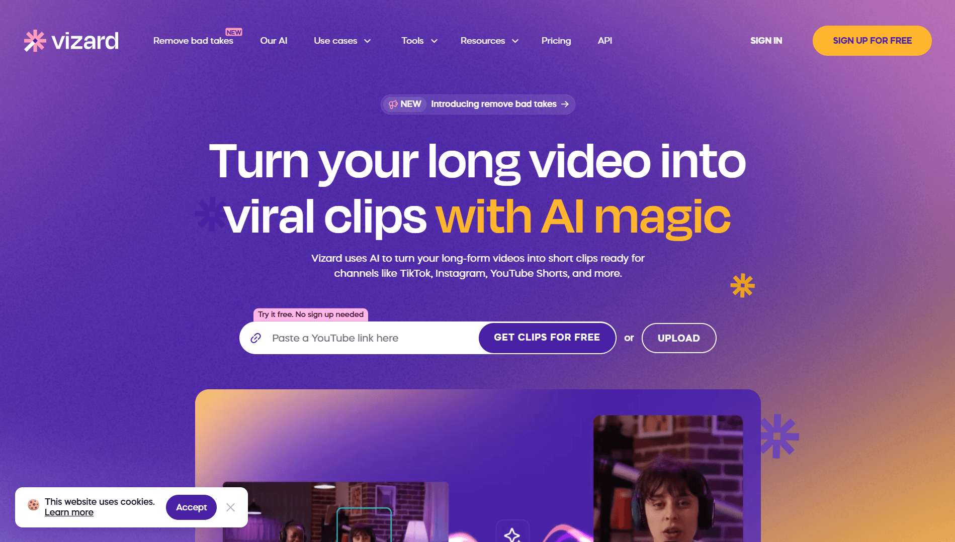 Vizard is an AI video tool that automatically extracts and edits short, engaging clips from long-form videos, adding captions, reframing, and optimizing them for platforms like TikTok, Reels, and Shorts.