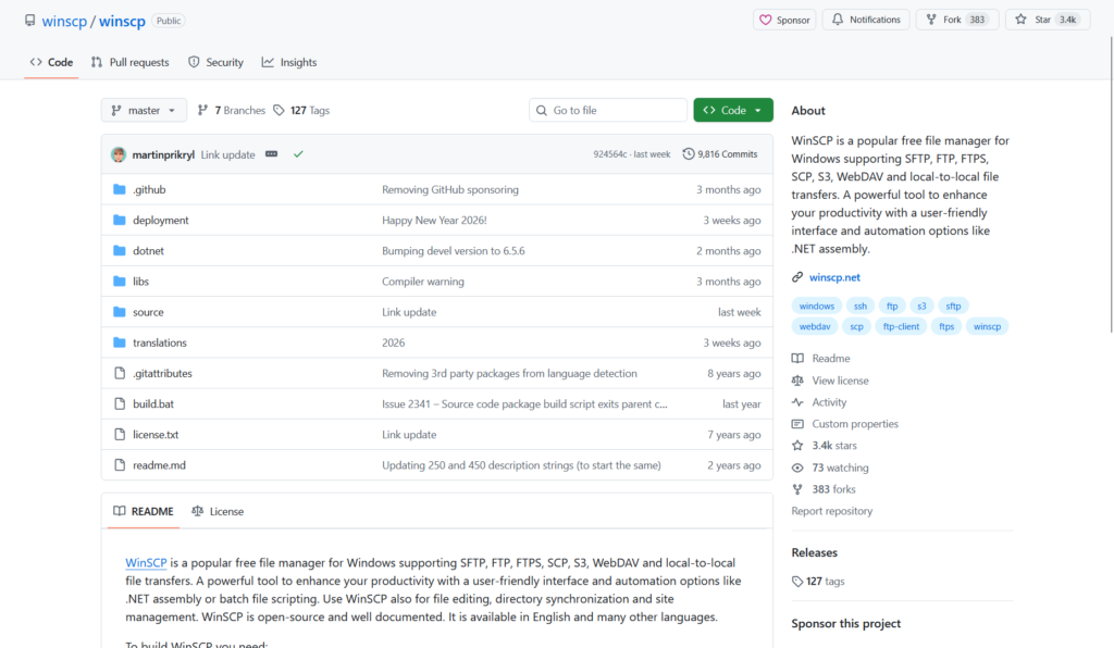 WinSCP is a popular open-source file manager for Microsoft Windows that supports secure file transfer protocols including SFTP, SCP, FTP, FTPS, WebDAV, Amazon S3, and local-to-local transfers.